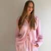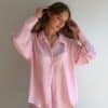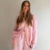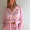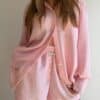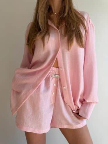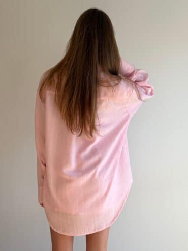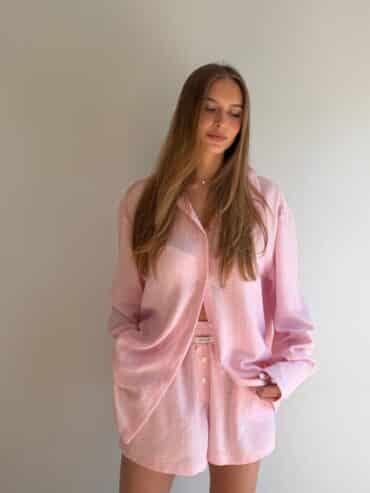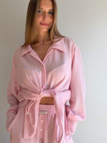 Koszula lniana o oversize’owej formie, zapinana na guziki, z klasycznymi mankietami wykończonymi jednym guzikiem. Wykonana z lekkiego, przewiewnego lnu, który zapewnia komfort noszenia nawet w najcieplejsze dni. Model w wyjątkowym kolorze baby pink w białe paseczki, który jest dziewczęcy i dodaje stylizacji świeżości. Koszula doskonale sprawdzi się noszona w komplecie z szortami z tej samej linii oraz stanikiem tworząc spójny, letni look.