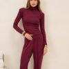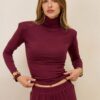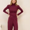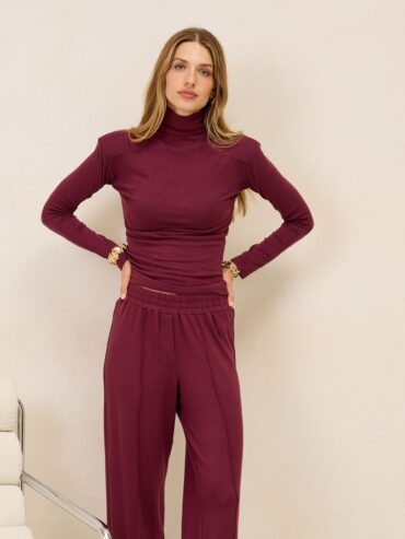 Komplet Houston Burgundy składa się ze spodni na gumce oraz golfu, wszystko wykonane z elastycznej dzianiny .