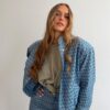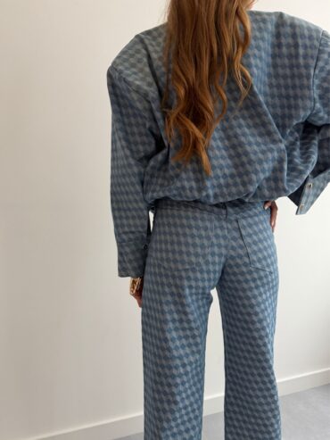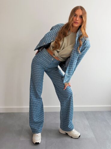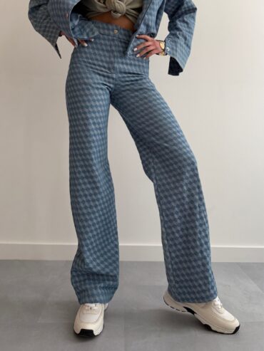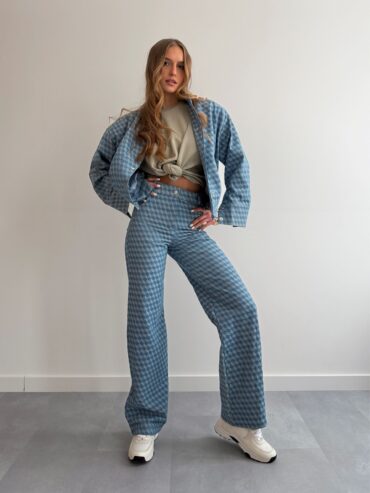 Jeansowe spodnie o oryginalnej fakturze w dwukolorowe romby to propozycja, która przyciąga uwagę i nadaje stylizacji wyjątkowego charakteru. To idealny wybór na wiosnę – lekkie, wygodne i jednocześnie wyraziste. Geometryczny wzór subtelnie ożywia klasyczny denim, dzięki czemu spodnie świetnie sprawdzą się zarówno w codziennych, jak i bardziej dopracowanych casualowych zestawach. Spodnie zapinane są na guzik oraz zamek, z tyłu znajdują się praktyczne kieszenie, które podkreślają fason i dodają całości ponadczasowego, jeansowego charakteru.
